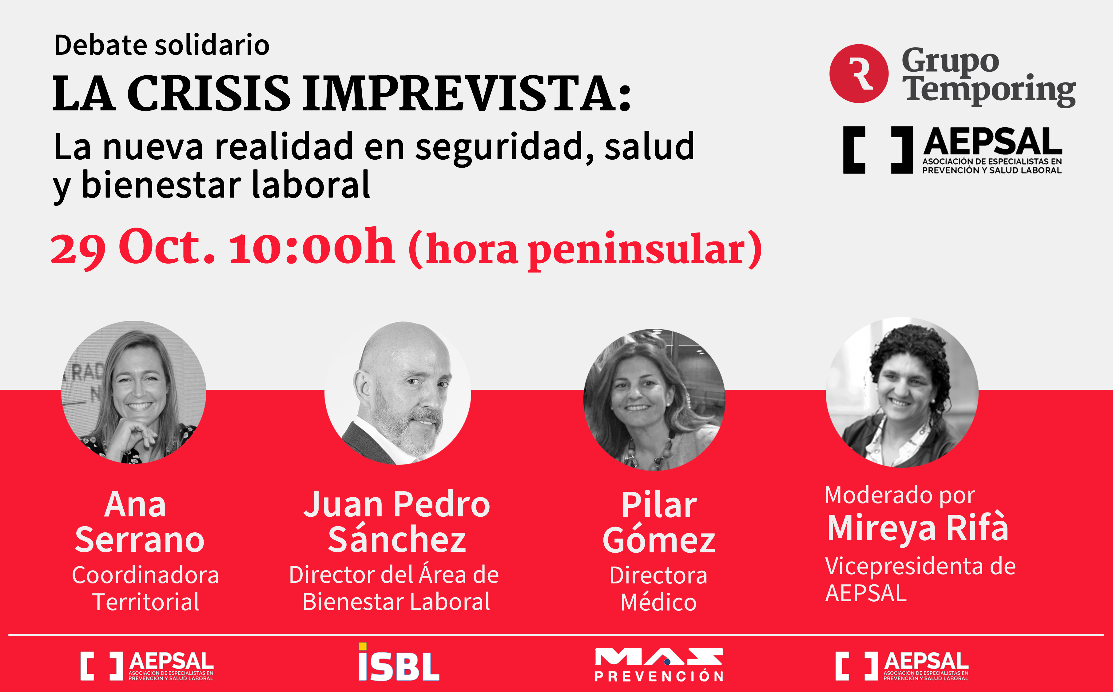 La Asociación de Especialistas en Prevención y Salud Laboral (AEPSAL) y Grupo Temporing organizamos el Debate Solidario La crisis imprevista: La nueva realidad en seguridad, salud y bienestar laboral.